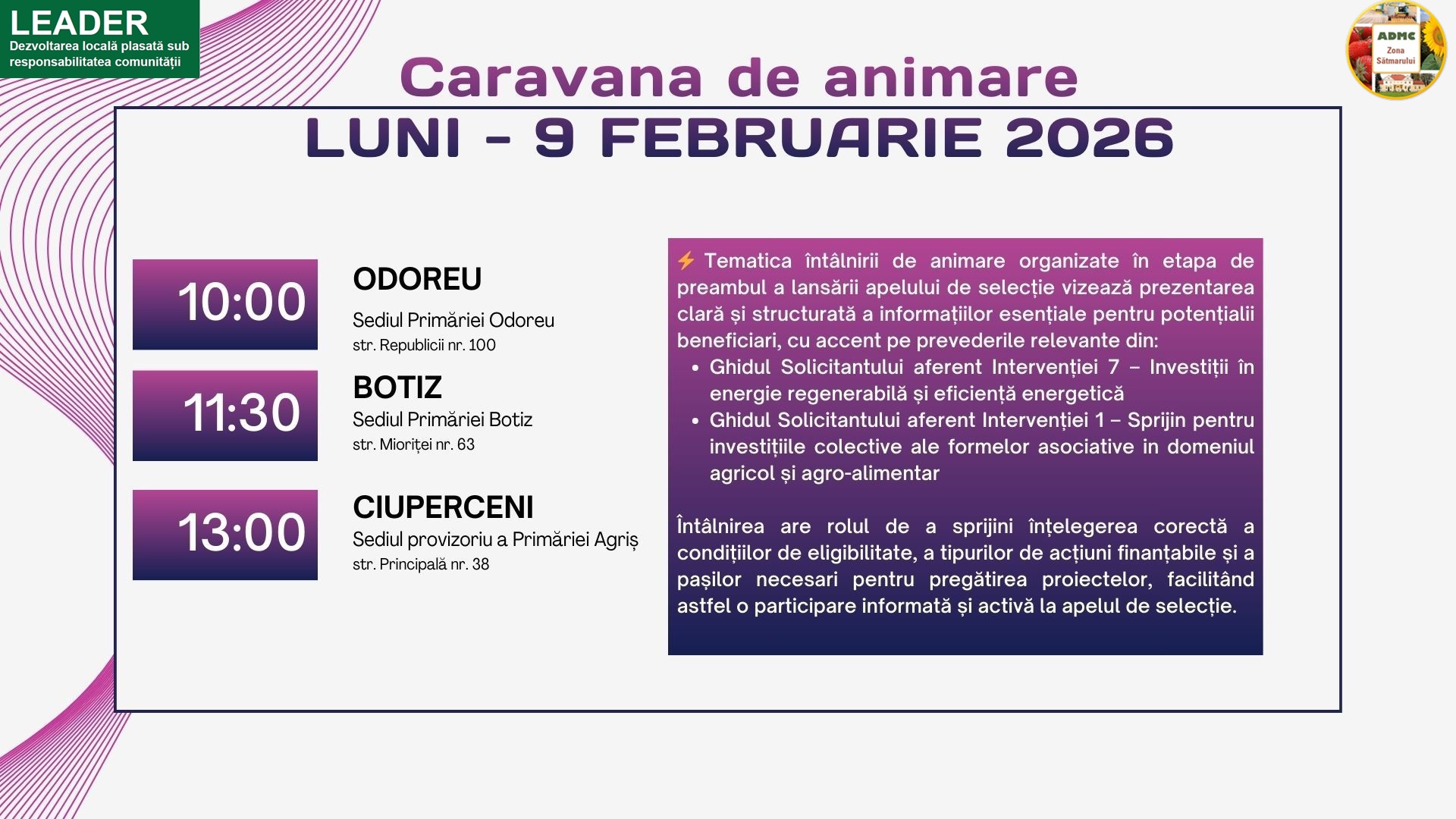 Vă așteptăm cu drag să discutăm despre noile oportunități de dezvoltare pentru comunitățile noastre – de la idee, până la rezultat concret!